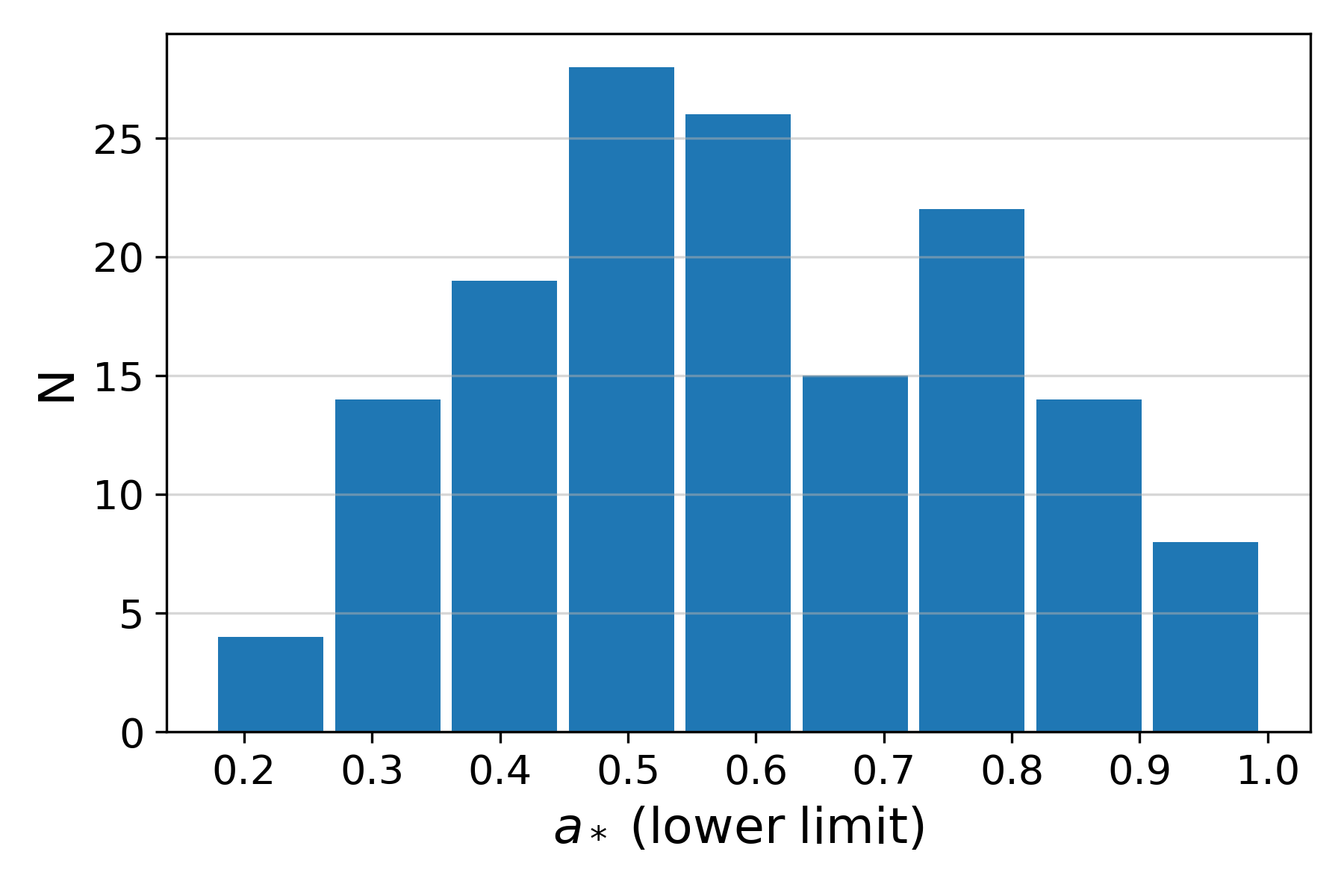 Having estimated the jet efficiencies, we used a simulation-based model to estimate the black hole spins. We found that, overall, these black holes are rotating very fast: the average spin was 0.84. This result is consistent with scenarios for the cosmological evolution of SMBHs which support rapidly rotating black holes as their host galaxies — and the black holes themselves — merge.